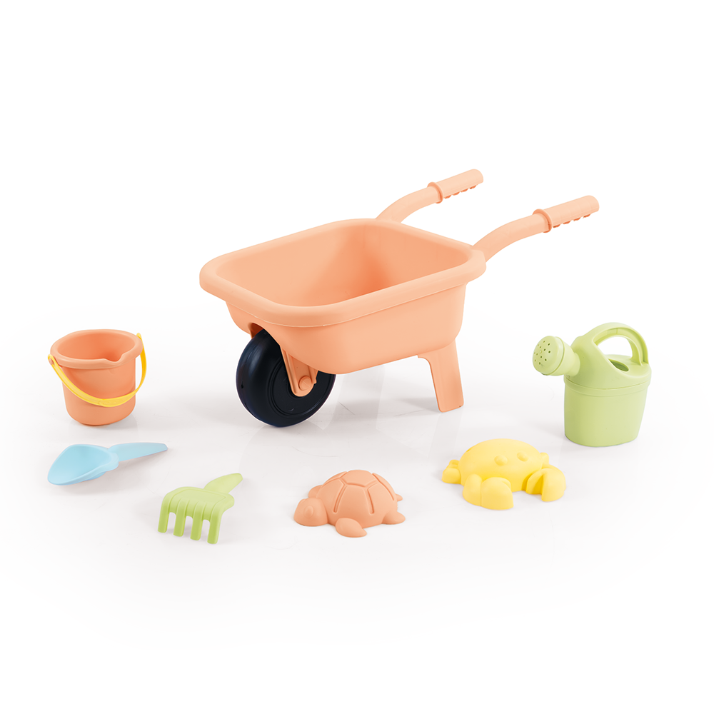 - Inhoud: 1x Kruiwagen, 1x Emmer, 1x Schep, 1x Hark en diverse zandvormpjes