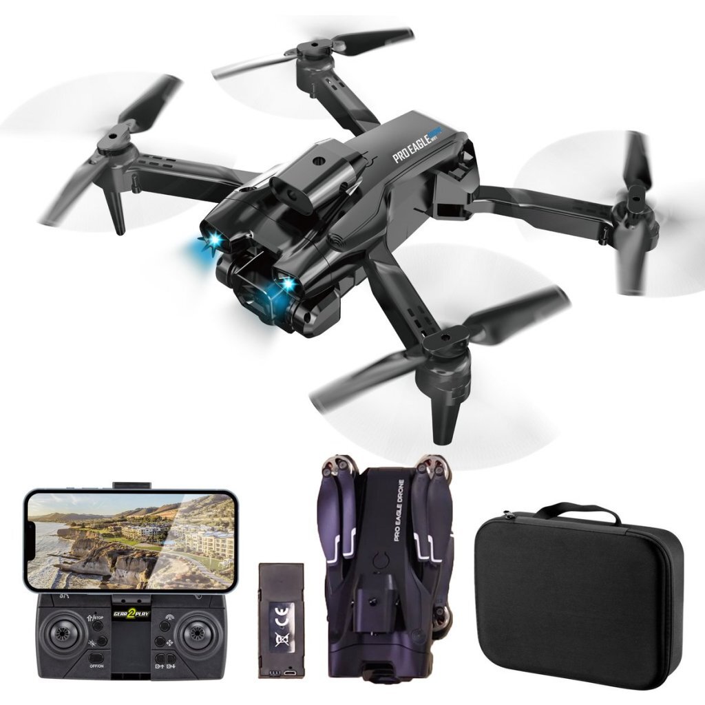 De 2.4 Ghz Pro Eagle Drone met WiFi camera is een spectaculaire WiFi drone met 2 ingebouwde camera’s voor het maken van foto’s en video’s vanuit alle mogelijke hoeken tijdens de vlucht. De camera kan door de controller naar boven en beneden worden bestuurd om videobeelden van voren of onderen te kunnen vastleggen. De drone is eenvoudig te besturen en te bedienen met de meegeleverde controller of via je smartphone. Download de gratis app, maak verbinding en bekijk de beelden vanuit de lucht live op je smartphone d.m.v. de WiFi verbinding tussen de drone en je smartphone. De Pro Eagle Drone heeft een aantal speciale features, zoals het maken van 360 graden flips/loopings, een headless functie en de auto return functie, waarmee de drone met een druk op de knop zal terugkeren naar de controller. De drone zal ook obstakels tijdens de vlucht detecteren en uit de weg gaan. Voorts beschikt de drone over 6 kanalen voor het vliegen in alle richtingen en drie verschillende vliegsnelheden waardoor hij geschikt is voor zowel beginnende vliegers als meer ervaren vliegers. De LED verlichting zorgt voor nog meer beleving tijdens de vlucht.