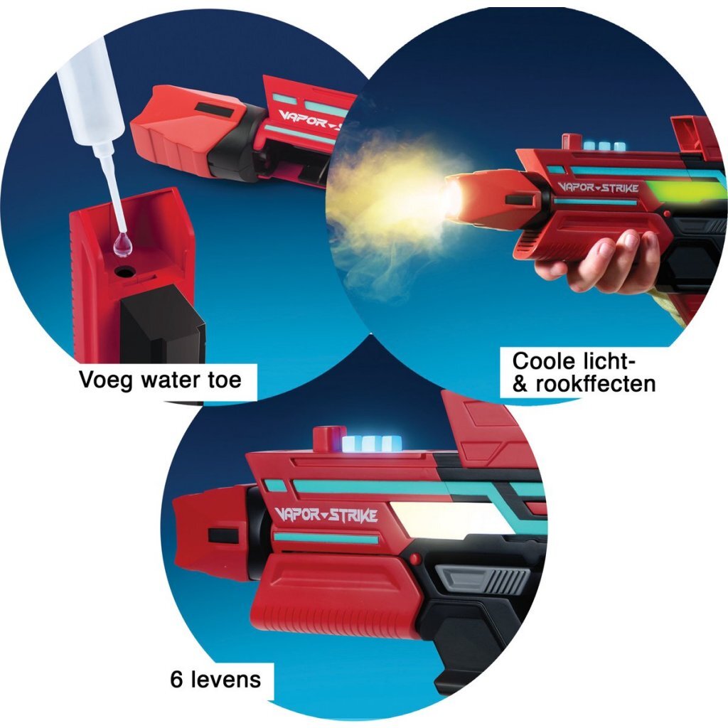 Daag je vrienden uit en ga de ultieme strijd aan! De duoset bevat twee grote blasters voor spannende lasergame-gevechten. Voeg water toe om coole, oplichtende damp te maken, zodat je kunt zien hoe sterk je schot is. Met geluidseffecten en trillingen voelt het alsof je echt in de strijd zit. Elke Blaster beschikt over 3 Explosie modi (Blast modi): met Single Blast schiet je 1 keer en kun je 1 leven van je tegenstander verwoesten, bij Triple Burst schiet je blaster drie keer achter elkaar waarmee je max. 3 levens kunt verwoesten en bij Hyperburst wordt al je munitie opgeschoten waarmee je in één klap alle levens van je tegenstander kan verwoesten! Geschikt voor kinderen vanaf 6 jaar.