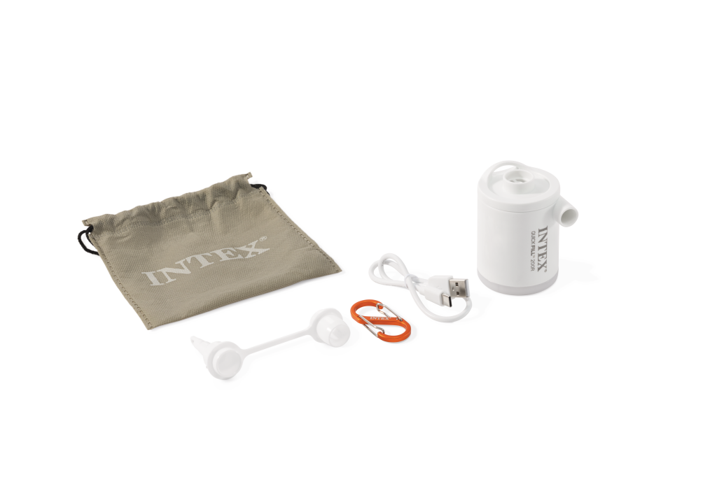 De Intex „QuickFill USB200R Tiny Air Pump” is compact, krachtig en oplaadbaar. Met LED-licht, karabijnhaak en twee mondstukken.