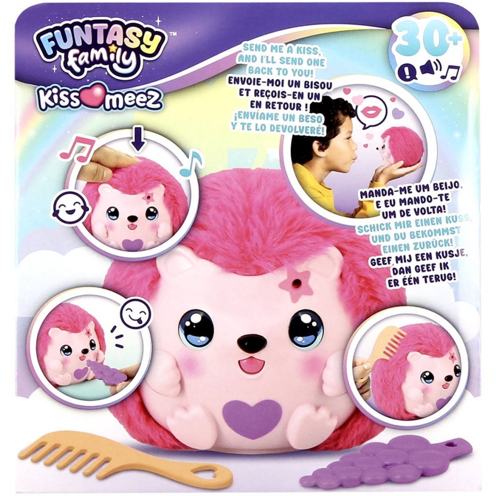 Een vrolijke interactieve plush knuffel die dol is op kusjes en knuffels! Geef haar een kusje en ze stuurt er meteen eentje terug. Aai haar zachte vacht of kietel haar buikje en luister hoe ze giechelt van plezier. Kam haar pluizige haar en geef haar haar favoriete hapje voor extra verzorgingsplezier. Met meer dan 30 reacties is deze interactieve egel een lief speelkameraadje dat verzorgend spel stimuleert. Geschikt voor kinderen vanaf 3 jaar.