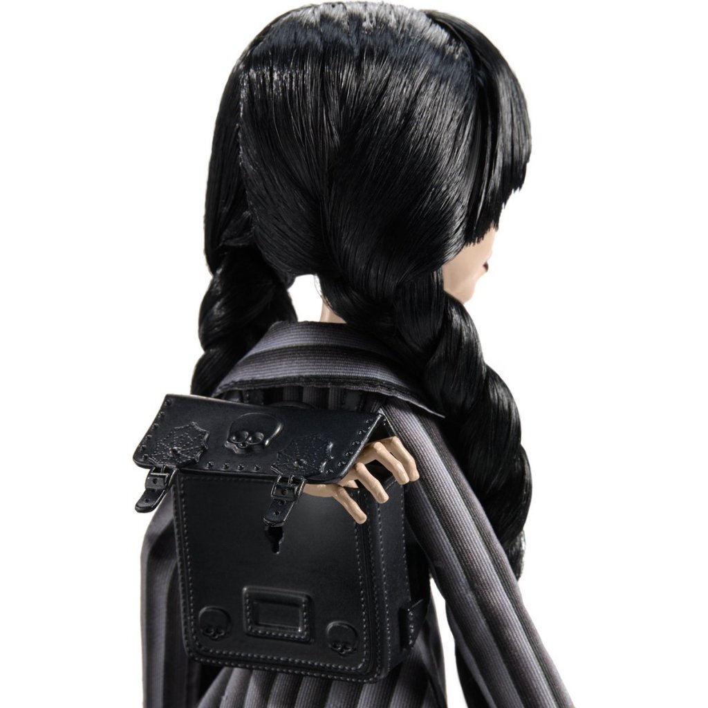 Deze Wednesday Addams pop om te verzamelen is van top tot teen gehuld in angstaanjagend zwart en zit vol charme in haar Nevermore Academy uniform. Thing zit op haar schouder en ze draagt ijzingwekkende schoenen, waardoor ze er helemaal klaar voor is om duistere mysteries te ontrafelen. Pop kan niet los staan. Poppenstandaard inbegrepen. Afwijkende kleuren en versieringen mogelijk.