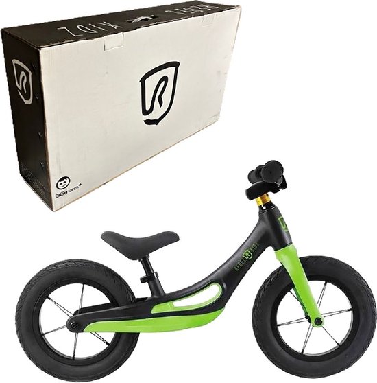 De 12 inch loopfiets heeft een strak en speels design. Het zwart met groene frame is stijlvol gevormd en heeft mooie contouren.