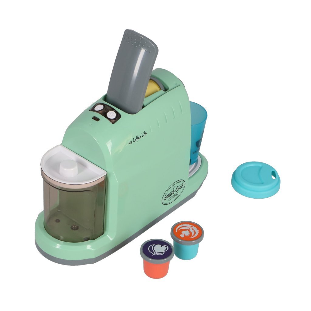 Speelgoed koffiemachin (mintkleur)met 3 cups om in de machine te doen. Vul hem met water en zet hem aan om het water in de beker te laten lopen. De beker veranderd van kleur wanneer hij gevuld wordt met water. Doe alsof je zelf koffie zet. Geschikt voor kinderen vanaf 3 jaar.